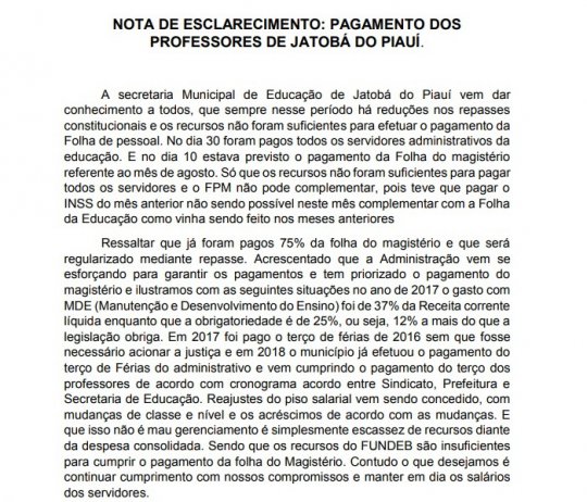 Professores da rede municipal de Jatobá do Piauí (134 km ao norte de Teresina) iniciaram nesta segunda-feira (17/09) paralização por tempo indeterminado por falta de pagamento de salários. Acordado para receber os vencimentos no dia 10 do mês seguinte ao trabalhado, o mês de agosto não foi pago na data. A prefeitura propôs pagar 65% da folha, alegando falta de recursos, mas a proposta não foi aceita pela categoria.