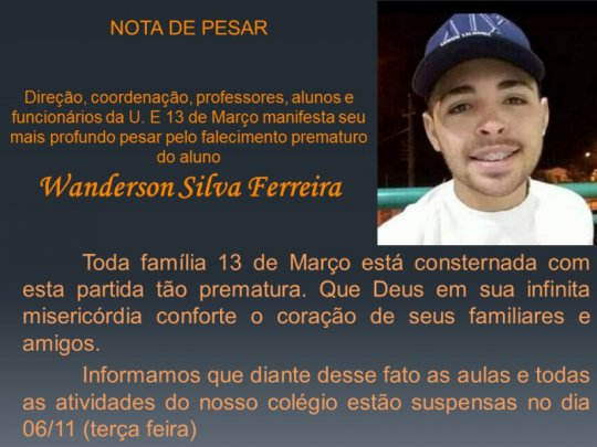 A direção da Escola 13 de Março, onde ele estudava, emitiu uma nota lamentando o falecimento do aluno e informando a suspensão das aulas.