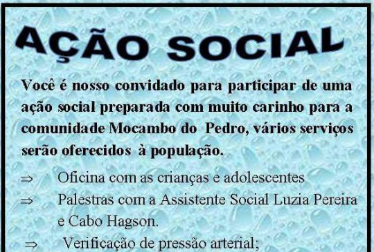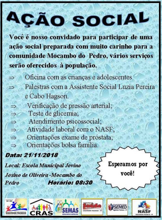 A prefeitura de Sigefreedo Pacheco, através da secretaria municipal de Assistência Social, realiza nesta quarta-feira (21/11) um dia de Ação Social na comunidade Mucambo do Pedro, zona rual do município. O evento teve abertura agora há pouco e segue até a tarde, na Unidade Escolar Jovino Josino de Oliveira.
