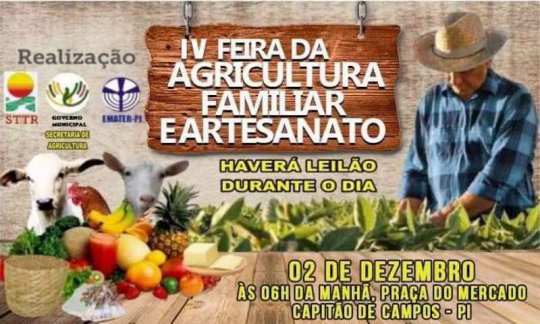 A prefeitura de Capitão de Campos em parceria com o Sindicato dos trabalhadores e trabalhadoras rurais e o EMATER-PI realiza nesse domingo, dia 02 de dezembro, a IV edição da feira do trabalhador rural e artesanal em Capitão de Campos.