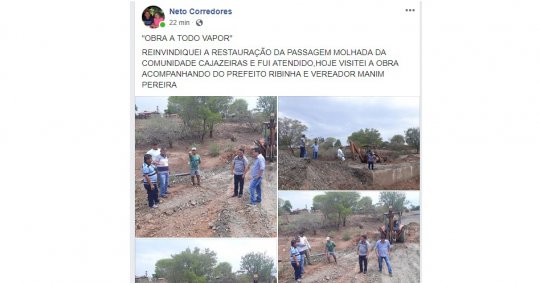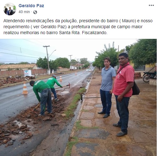 Nesta semana os vereadores Geraldo Paz (Pros) e Neto dos Corredores (PDT) fizeram postagens em suas redes sociais agradecendo ao Prefeito Professor Ribinha pelo atendimento aos requerimentos por eles apresentados na Câmara onde solicitavam melhorias em mobilidade. Geraldo Paz solicitou melhorias no perímetro urbano da rodovia que liga Campo Maior a Cabeceiras na altura do Bairro Santa Rita e Neto dos Corredores reivindicou a restauração da Passagem Molhada da Comunidade Cajazeira, zona rural de Campo Maior. O parlamentar visitou a obra acompanhado do prefeito e do vereador Manim Pereira.