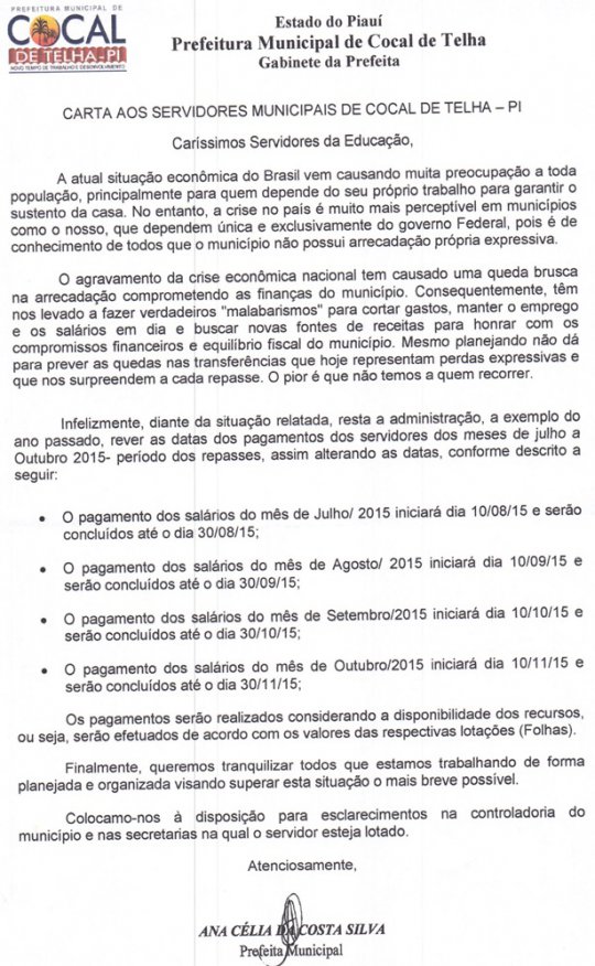 A Carta relata a situação financeira do município e reorganiza o pagamento dos servidores. Segundo a assessoria da Prefeitura de Cocal de Telha a mudança se deu devida a escassez de recursos federais e que penaliza diretamente setores específicos do município haja vista que as demais áreas vem recebendo conforme previsão.