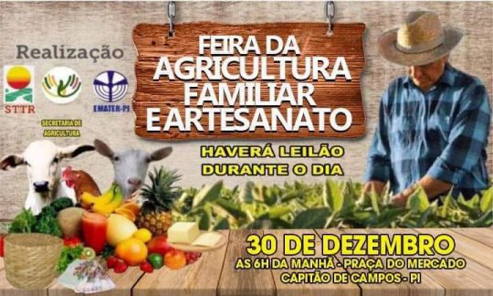 Acontece neste domingo (30/12), na cidade de Capitão de Campos, a Feira da Agricultura Familiar e Artesanato. O evento começa às 6h, na Praça do Mercado.