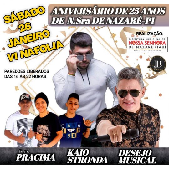 A Prefeitura Municipal de Nossa Senhora de Nazaré, divulgou a programação Da 6ª edição do NAFOLIA e também do 25º aniversário do município que é comemorado no mesmo dia. O tradicional Zé Pereira, abre as festividades carnavalescas no território dos carnaubais.