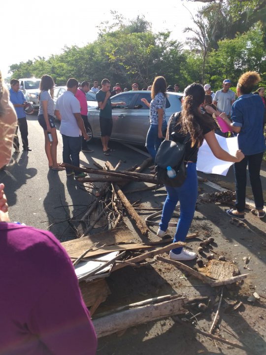 Os manifestantes usaram faixas e fizeram um cordão humano para fechar a BR. Usaram ainda pedaços de madeira no meio da pista.