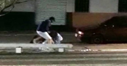 No vídeo, é possível ver o momento em que a esposa encontra o marido com a amante numa praça. Revoltada, ala começa a puxar o cabelo da amante e o marido tenta separá-las. Sem êxito, o homem resolve agredir a esposa com vários tapas em suas costas e no rosto.