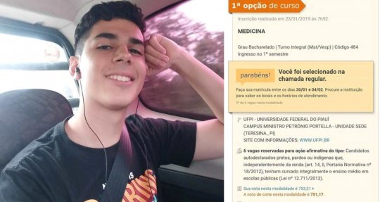 Um aluno da rede pública de Sigefredo Pacheco (190 km ao norte de Teresina) foi aprovado para o curso de Medicina no Sisu 2019, divulgado nesta segunda-feira (28/01) pelo Ministério da Educação. Francisco Emanuel Andrade Peres, com 18 anos completados em setembro de 2018, já havia sido destaque com nota 960 em redação no Enem hoje foi coroado com a vaga para o curso de Medicina, o mais concorrido na Universidade Federal do Piauí.