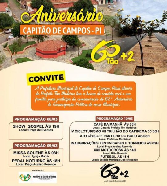 O município de Capitão de Campos completa neste domingo 62 anos de emancipação política. A programação comemorativa iniciou na sexta-feira e encerra neste domingo com o show da Banda Solteirões do Forró.