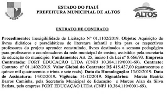 A prefeita de Altos, Patrícia Leal celebrou contrato no valor de R$ 415.437,00 (quatrocentos e quinze mil e quatrocentos e trinta e sete reais) com a empresa cearense Fort Educação Ltda para aquisição de livros didáticos e paradidáticos de literatura infantil e kits para os respectivos professores e coordenadores da rede municipal. O contrato foi assinado no dia 14 de fevereiro e terá duração até 31 de dezembro de 2019.