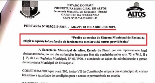 Em vez de dá o fardamento aos alunos, a prefeita de Altos, Patrícia Leal, decidiu abdicar da obrigatoriedade o traje de identificação dos estudantes. A decisão foi tomada pela gestora após denuncias do Presidente da Câmara, Vereador Maxwell da Mariinha, líder da oposição, na sessão do dia 29 de março deste ano.