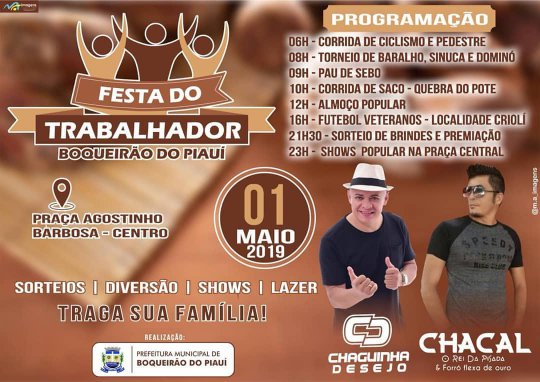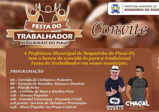 A Prefeitura Municipal de Boqueirão do Piauí tem a honra de convidar toda a população Boqueiroense e cidades vizinhas a participarem da tradicional comemoração ao Dia do Trabalhador, que acontecerá no dia 1° de maio.