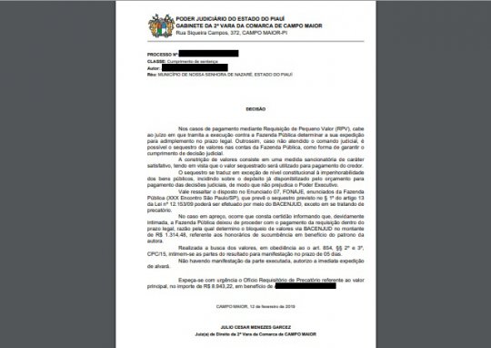 O legado do caos administrativo deixado pela ex-prefeita cassada Luciene Silva de Nossa Senhora de Nazaré ainda hoje afeta a população nazarena. Nesta quinta-feira (18) estava previsto o segundo repasse constitucional do FPM (Fundo de Participação dos Municípios) de abri, no entanto o Prefeito Luizinho Cardoso foi surpreendido com o sequestro de R$ 63.282,96 mil reais.
