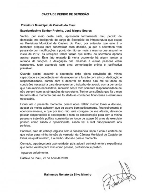 Confira na íntegra a carta de pedido de demissão enviada ao prefeito Magno Soares