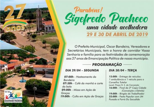 O município de Sigefredo Pacheco, na região dos carnaubais, completa 27 anos de emancipação política nesta segunda-feira (29/04). Pela manhã, foram iniciadas as comemorações com o hasteamento das bandeiras, corte do bolo, café da manhã e em seguida Missa em Ação de Graças.