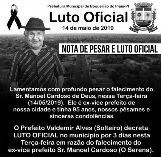 O prefeito de Boqueirão do Piauí, Solteiro Alves (PT) decretou luto oficial de três (3) dias no município em homenagem ao ex-vice-prefeito.