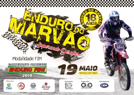 O Enduro do Marvão, tradicional prova off-road da região de Castelo do Piauí, ao norte do Estado, chega à maioridade, completando seus 18 anos de existência. A prova para pilotos de moto federados acontecerá no dia 19 de maio, com vistorias, briefing e entrega de kits no dia 18 de maio, na cidade de Castelo do Piauí.