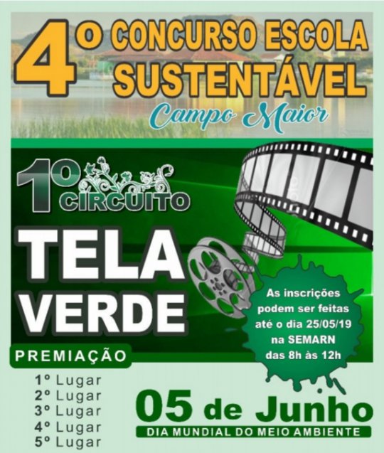 Escolas municipais e estaduais de Campo Maior têm até sábado (25.05) das 08 às 12 h, para realizar as inscrições da 1° edição do Circuito Tela Verde. O projeto realizado pela Prefeitura de Campo Maior por meio da Secretaria Municipal de Meio Ambiente e Recursos Naturais – SEMARN é uma nova versão do Concurso Escola Sustentável.
