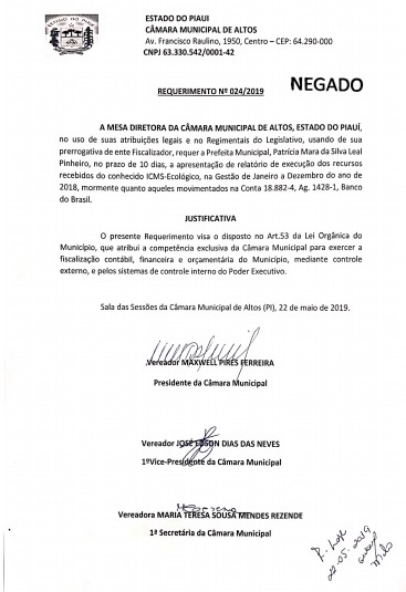 A mesa diretora da Câmara Municipal de Altos que tem como presidente o vereador Maxwell da Mariínha enviou um requerimento para aprovação na sessão da câmara realizada na manhã desta sexta-feira (24), solicitando que a prefeita de Altos, Patrícia Leal (PT) apresente o relatório de execução dos recursos recebido do ICMS-Ecológico e do tributável de janeiro a dezembro de 2018.