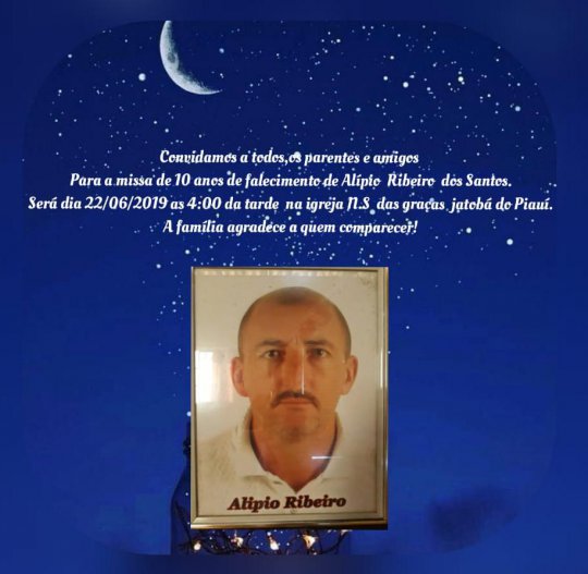 A Família de Alípio Ribeiro convida parentes e amigos e o povo em geral para a celebração de missão de 10 ano de saudades eterna pela memória do pai, amigo, esposo, avó e homem publico Alípio Ribeiro dos Santos.