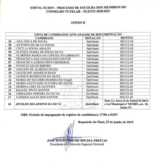 A Comissão Especial Eleitoral - CEE divulgou na última quarta-feira (26), a relação dos candidatos aptos após a análise da documentação para o registro da candidatura a Conselheiro Tutelar no município de Boqueirão do Piauí.