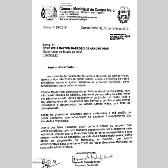 A presidência da Câmara Municipal de Campo Maior encaminhou na manhã desta segunda (01/07) um ofício ao Governador do Piauí, Wellington Dias, pedindo ajuda financeira para obras emergenciais do município e um “aporte administrativo”, com o objetivo de orientar o Poder Executivo Municipal na condução administrativa.