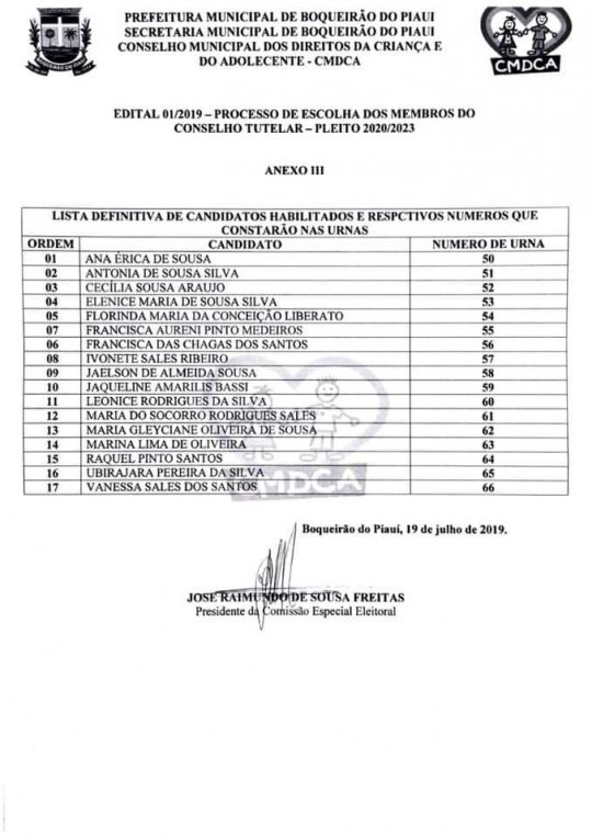 Dando continuidade ao processo de escolha dos membros do Conselho Tutelar de Boqueirão do Piauí, pleito 2020/2023, o Conselho Municipal dos Direitos da Criança e do Adolescente divulgou a lista definitiva dos candidatos habilitados a concorrerem as vagas de Conselheiro Tutelar no município.