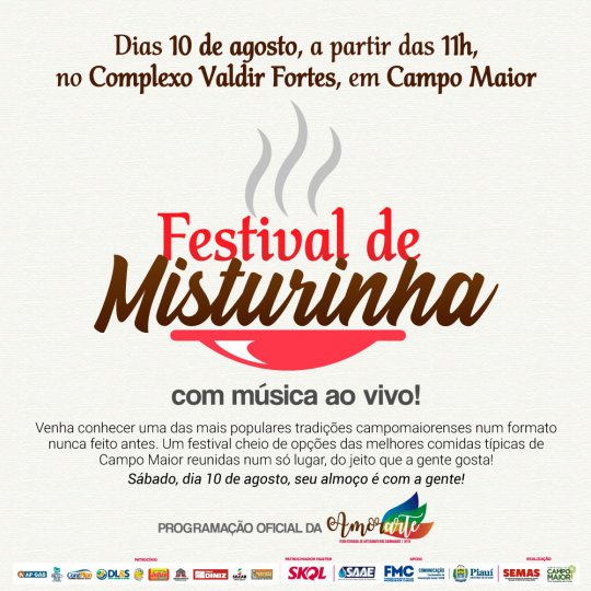 O festival acontecerá no dia 10 de agosto, a partir das 11:00 horas no Complexo Valdir Fortes, trazendo diversas opções das melhores comidas típicas do município e apresentando uma das populares tradições dos campomaiorenses em um formato diferente.