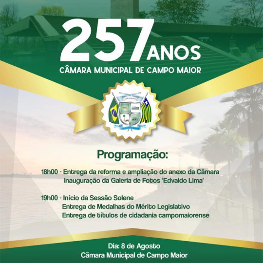 No dia 8 de agosto de 2019 a cidade de Campo Maior irá completar 257 anos, e junto com ela, a Câmara Municipal de Campo Maior, instituição pública e política mais velha do município. Dentro das comemorações de mais um ano do legislativo municipal e da cidade, acontecerá no Palácio do Jenipapo uma programação especial, contando com a presença dos parlamentares, representantes dos Poderes Executivo e Judiciário, e sociedade campomaiorense.