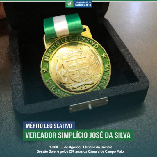 Nesta quinta-feira, 8 de agosto, a Câmara Municipal de Campo Maior entregará pela primeira vez uma honraria exclusiva do Poder Legislativo campomaiorense: A medalha do Mérito Legislativo Vereador Simplício José da Silva.