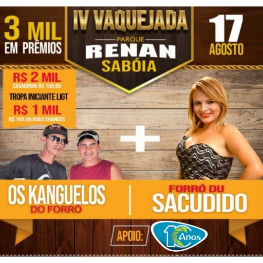 Você que é apaixonado por vaquejada prepare-se porque neste sábado, dia 17 de agosto, acontece a 4ª edição da Vaquejada do Parque Renan Sabóia em Jatobá do Piauí. O Parque Renan Sabóia está localizado na localidade Santa Rosa, na PI que liga Jatoba do Piauí à BR-343, à 20km de Campo Maior