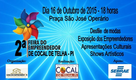 A Prefeitura de Cocal de Telha, a Casa do Empreendedor e o Serviço Brasileiro de Apoio a Micro e Pequenas Empresas – SEBRAE; tem a grata satisfação em convidar Cocal de Telha e região para participarem da 2ª. Feira do Empreendedor que acontecerá dia 16, sexta-feira, a partir das 18 horas no Calçadão da Praça São José Operário.