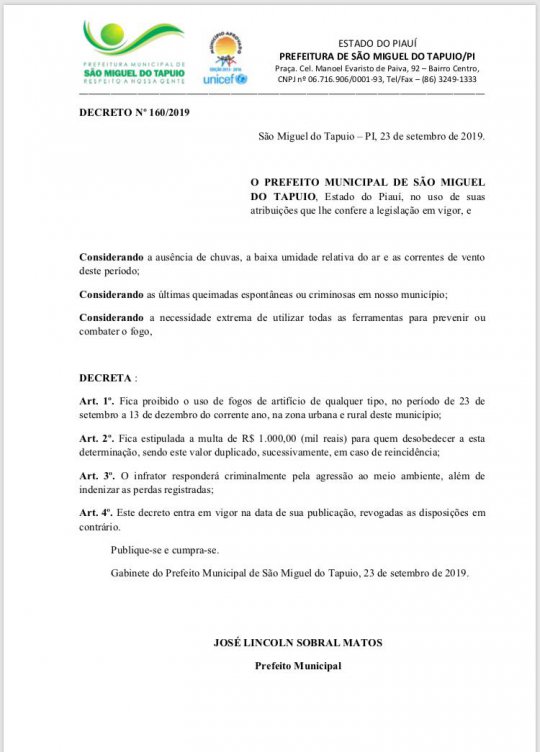A prefeitura de São Miguel do Tapuio, através do DECRETO No 160/2019, desta segunda-feira(23), proibiu o uso de fogos de artificio de qualquer tipo, no período de 23 de setembro a 13 de dezembro do corrente ano, na zona urbana e rural deste município.