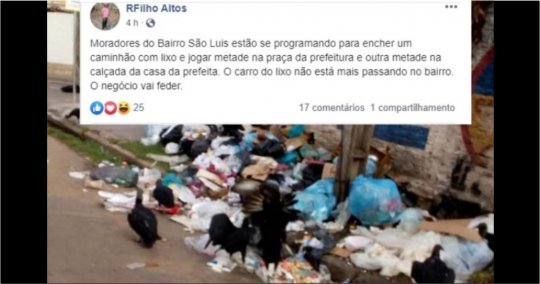 Um internauta que reside no Bairro São Luís postou no facebook que, em repúdio a situação, os moradores do referido bairro estão se mobilizando para encher um caminhão de lixo e jogar metade na praça da prefeitura e a outra metade na calçada da prefeita, pois por lá o carro da coleta nunca mais passou. Veja abaixo: