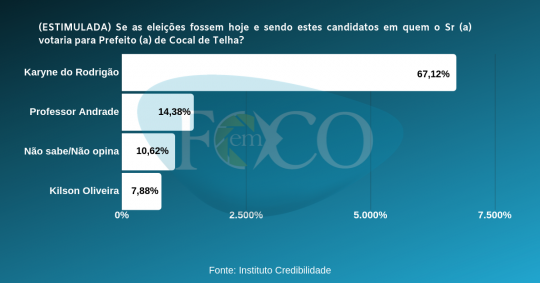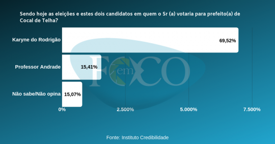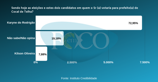 O Instituto Credibilidade divulgou nesta quinta-feira (17/10) uma pesquisa de intenções de votos que mostra o cenário político na corrida eleitoral para a eleição de prefeito da cidade de Cocal de Telha (PI).