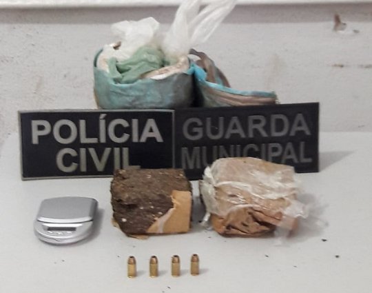 Em busca na residência, foram localizados: metade de um tablete de maconha prensada, quatro munições .380 e uma balança de precisão.