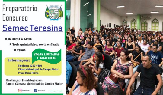 A Fundação Legislativa de Campo Maior – Fundalegiscam, por meio da Câmara Municipal de Vereadores de Campo Maior, estará oferecendo mais um curso preparatório. Dessa vez, destinado a quem pleiteia uma vaga no Concurso da SEMEC – Teresina. A inscrição ocorre até amanhã, dia 1 de novembro, devendo ser realizada presencialmente. Os interessados deverão comparecer à Câmara de Vereadores portando os documentos pessoais para a confirmação da matrícula e recebimento dos materiais.