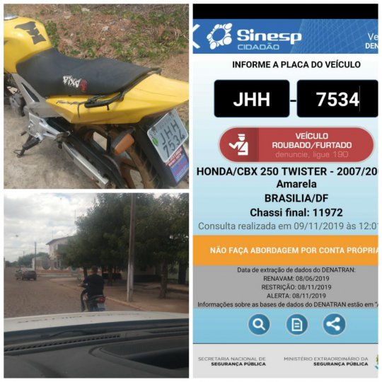 Ao consultar a placa JHH-7534 foi encontrado registro de Roubo/Furto. Os policias perguntaram sobre a procedência da mesma, o condutor informou que comprou em Brasília, e que a mesma foi enviada de ônibus, por um terceiro, cujo nome coincide com proprietário da moto na consulta do CRLV. O condutor informou ainda que não consultou a procedência nos órgãos de trânsito.