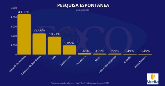 Para exemplificar, Maxwell da Mariinha teria, conforme a pesquisa, a preferência de 43,35% do total de 43,84% que responderam que já escolheram seu candidato a prefeito. Carlinhos Leal teria 22,66% dos 43,84% e assim sucessivamente.