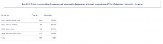 Conforme os dados coletados, o presidente da Câmara de Altos, vereador Maxwell da Mariinha segue na liderança na corrida eleitoral para a Prefeitura de Altos assim como já vinha sendo constatado nos levantamentos anteriores. Na pesquisa espontânea, quando somado somente os votos válidos, Maxwell aparece com 43,35% dos votos, Carlinhos Leal 22,66%, Neto Delmiro 19,21%, Patrícia Leal 9,85%, Dr Fonseca 1,48%, Marcio 0,99%, Não soube responder 0,99%, Expedito 0,49%, Jesus Pinheiro 0,49%.