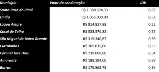 Segundo o relatório, os 10 municípios com mais condenações em improbidade administrativa, também integram a lista dos dos município abaixo da linha da probleza, segundo o ìndice de desenvolvimento Humano (IDH). "A primeira premissa estabelecida é de que os atos de improbidade administrativa analisados neste Projeto desviam recursos governamentais que poderiam ser direcionados para educação, saúde e programas sociais, o que impacta negativamente no bem-estar da população e, por óbvio, é refletido no IDH daquele município" diz o relatório.