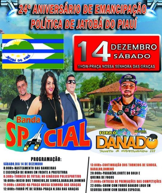 O município de Jatobá do Piauí comemora neste sábado 24 anos de emancipação política. Com previsão populacional de 4.865 habitantes em 2019, o município foi desmembrado de Campo Maior pela Lei 4.810, de 14 de dezembro de 1995, que criou Jatobá do Piauí e mais outros municípios do Piauí.