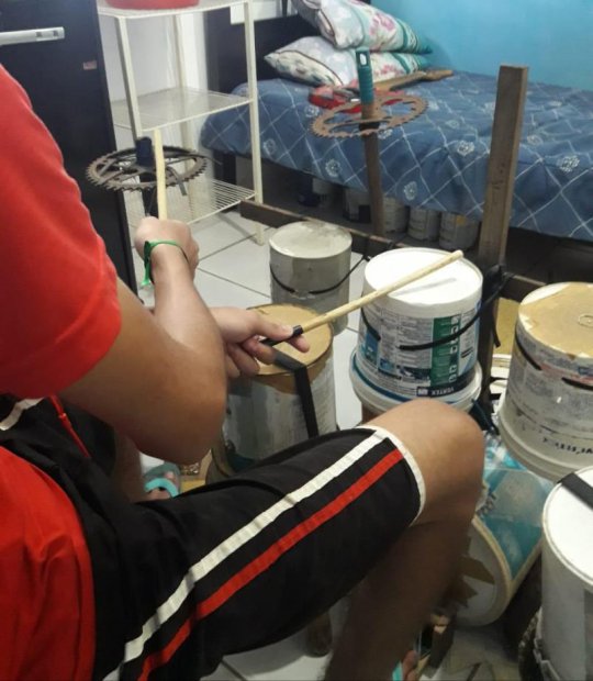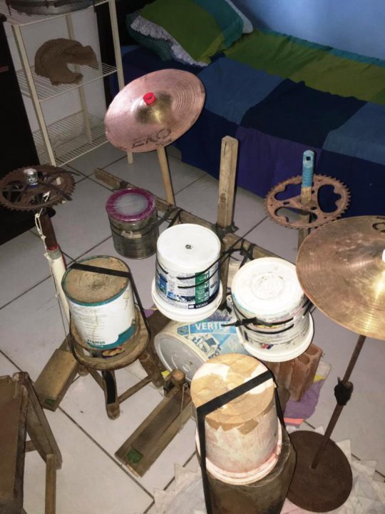 O adolescente usou a sua vontade de tocar e criatividade para fugir das dificuldades financeiras: galões de plástico, lata, peça de bicicleta, alguns pedaço de madeira, tijolos e ligas, tudo encontrado no lixo, e estava feita a primeira bateira improvisada do garoto. Montada dentro de seu próprio quarto, ao lado de sua cama, a bateria é o xodó de Luís Felipe, mas ele quer mais.