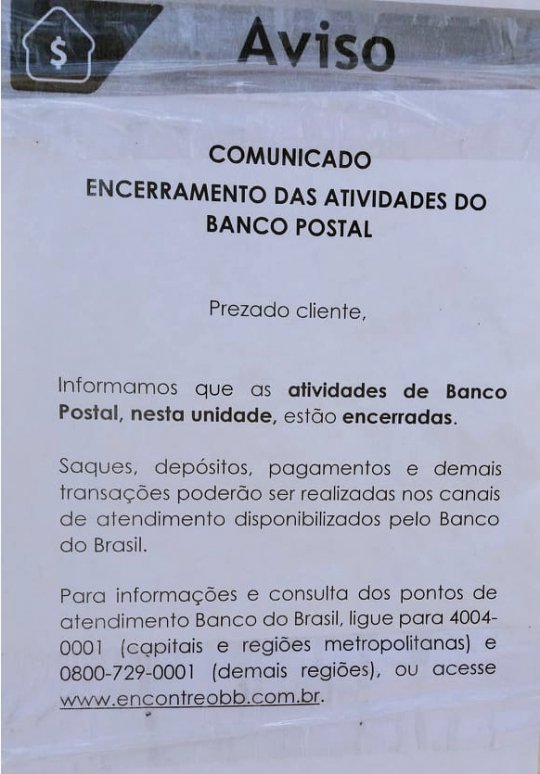 Na manhã desta segunda-feira (10) a informação foi expressa por meio de aviso em mural dos Correios/Agência Assunção do Piauí, comunicando o encerramento das atividades do Banco Postal (Serviços do Banco do Brasil) na cidade.