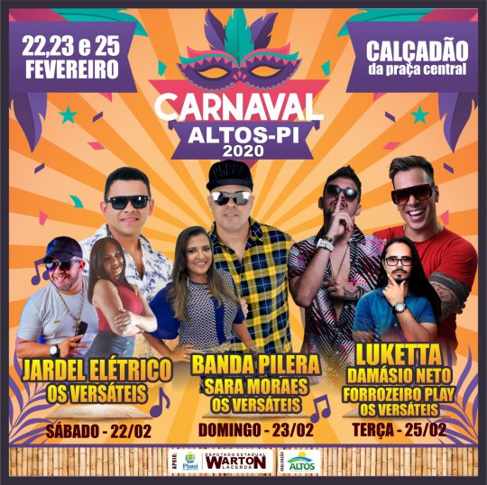 A Prefeitura de Altos divulgou, nesta quarta-feira (19), a programação do Carnaval 2020. Entre os dias 22 e 25 de fevereiro, várias bandas locais e regionais animarão a folia de momo na cidade. Jardel Elétrico anima a festa no dia 22. Já no dia 23, a folia inicia às 16h, com o Carnaval Infantil. Em seguida, a partir das 22h, Banda Pilera e Sara Moraes comandam a festa.
