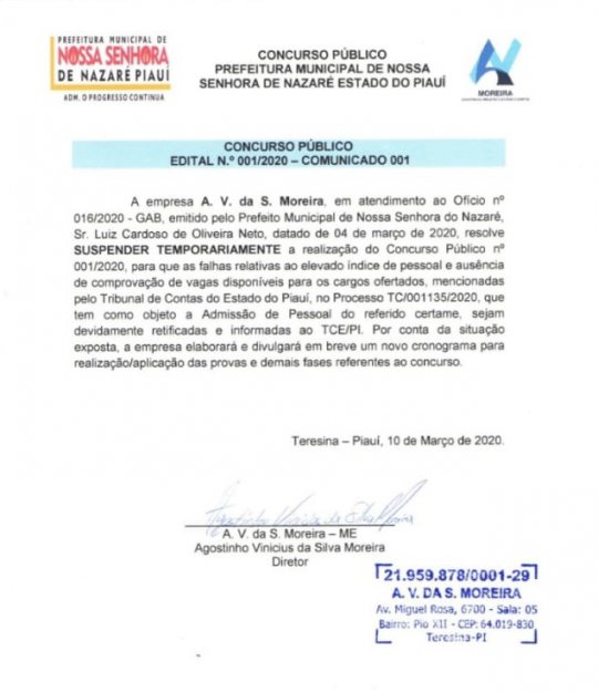 A prefeitura de Nossa Senhora de Nazaré divulgou nesta terça-feira (10) através de um comunicado que o concurso público do município foi adiado a pedido do Tribunal de Contas do Estado (TCE).