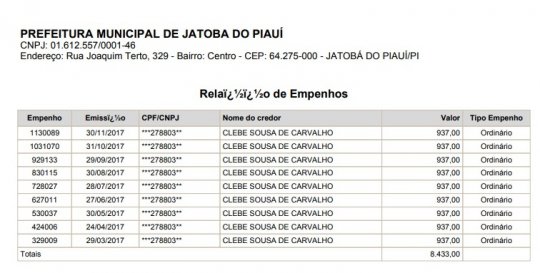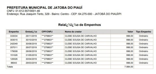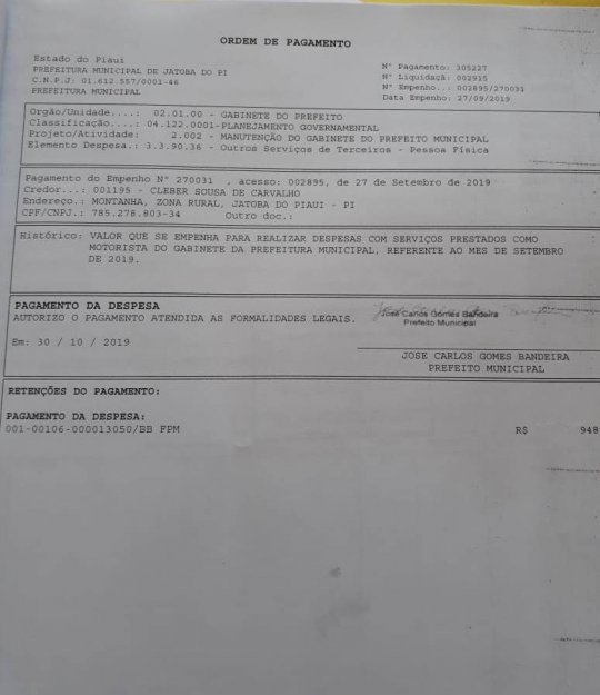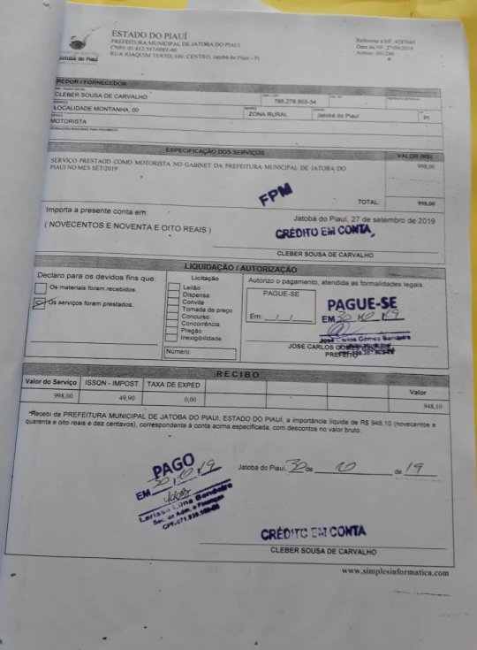 Um pequeno comércio de gêneros alimentícios e limpeza, frutas e frios, localizado no Bairro Matinha, próximo ao Campus da UESPI no Pirajá, em Teresina-PI. É lá que Cléber Sousa de Carvalho trabalha todo dia, junto à sua família. Mas ele recebe salário como funcionário da prefeitura municipal de Jatobá do Piauí (município a 134 km ao norte de Teresina). Cléber recebe salário como motorista lotado no gabinete do prefeito Zé Carlos Bandeira (PT).
