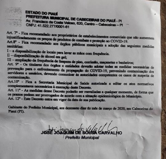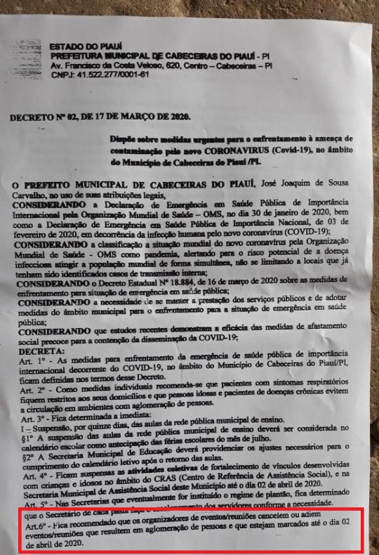 A data é tradicional, mas ocorre que o próprio prefeito já havia baixado um decreto no dia 17 proibindo esse tipo de evento pela cidade por conta dos riscos de contaminação pelo coronavírus, inclusive as aulas já haviam sido suspensas no município. O governo do estado do Piauí também já havia baixado decreto no mesmo sentido, no dia anterior. No dia 20, no entanto, o prefeito baixou outro decreto ratificando o primeiro e a partir dessa data não aconteceu mais eventos pela cidade.