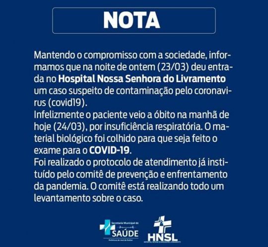 A nota diz ainda que o material biológico foi recolhido para que seja feito o exame para o covid-19 e que foi realizado o protocolo de atendimento já instituído pelo comitê de prevenção e enfrentamento da pandemia e que está sendo feito todo o levantamento sobre o caso.