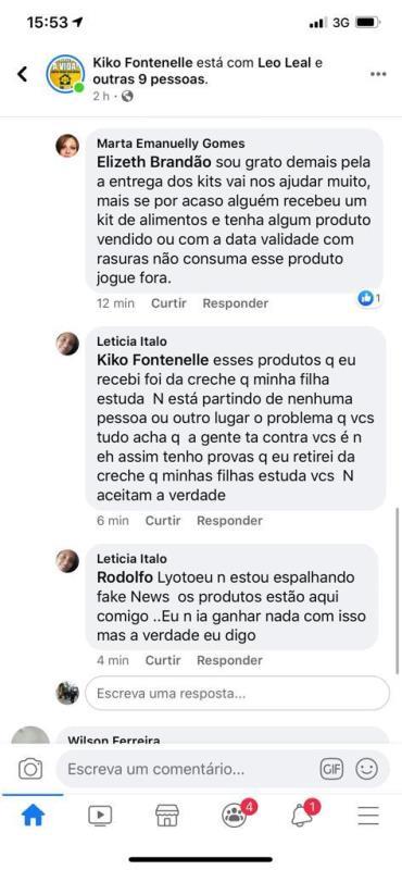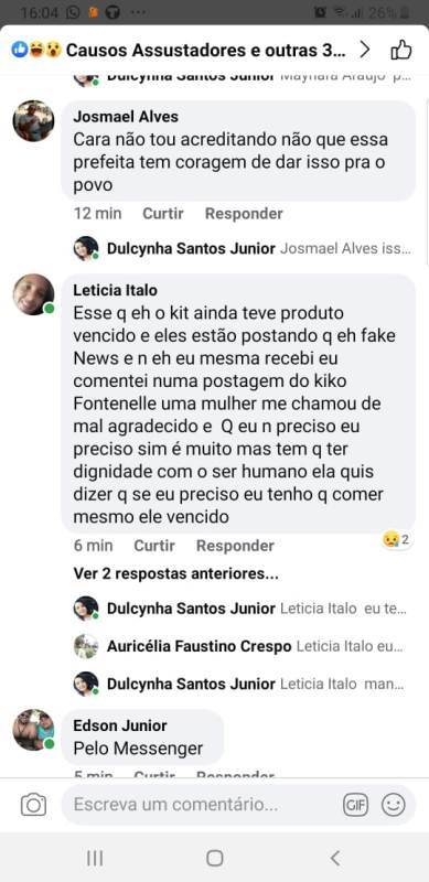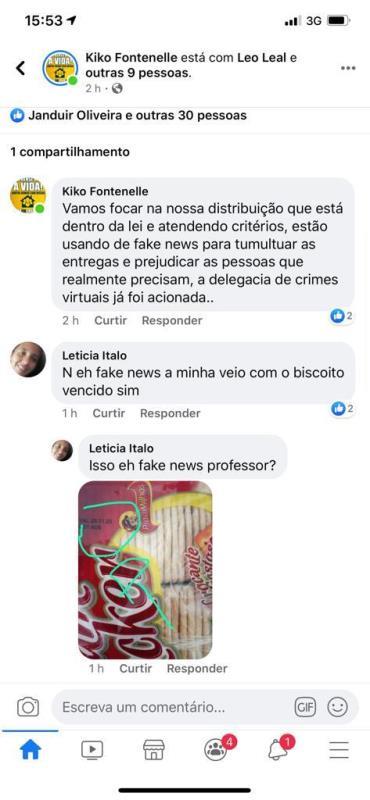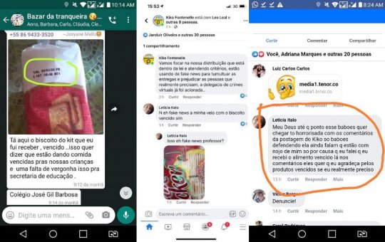 Letícia Ítalo, que também é mãe de um aluno da rede municipal usou grupos de whatsapp para divulgar uma foto que mostra um pacote de biscoito com data de validade vencida. O alimento estaria, segundo ela, no kit que recebeu da prefeitura. Após sua denuncia, a Secretaria emitiu uma nota alegando que seria fake news. Letícia se revoltou com o posicionamento da secretaria e foi para facebook e instagram rebater a nota. "Esse é o kit, ainda teve produto vencido e eles estão postando que é fake news e não é. Eu mesma recebi, comentei numa postagem do Kiko Fontenete (Vereador), uma mulher me chamou de mal agradecida e que eu não preciso. Eu preciso sim, e muito, mas tem que ter dignidade com o ser humano. Ela quis dizer que se eu preciso eu tenho que comer mesmo ele vencido", reagiu a mãe.