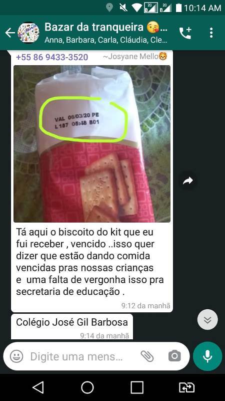 Josyane Mello, que também se apresenta como sendo mãe de aluno, postou no grupo ‘Bazar da tranqueira’ que também recebeu alimento com data de validade vencida. "Tá aqui o biscoito do kit que eu fui receber, vencido. Isso quer dizer que estão dando comida vencida para nossas crianças. É uma falta de vergonha isso para a secretaria de educação", comentou a mãe. O alimento, da imagem mostrada por Josyane, venceu no dia 06/03/2020.